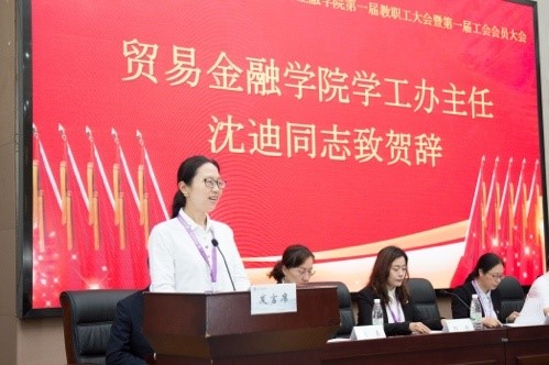 副校长、校工会主席梅亚萍代表校工会向大会的召开表示热烈祝贺,她充分肯定了贸金学院在党政领导的科学管理和全体教职工的努力下,在专业建设、师资队伍和人才培养方面取得的成绩。梅亚萍指出,大会的召开对于发挥教职工的积极性和创造性、促进学院发展和稳定具有重要作用,希望大家充分行使民主权利,为学院的创新改革认真履行职责、积极献言献策。