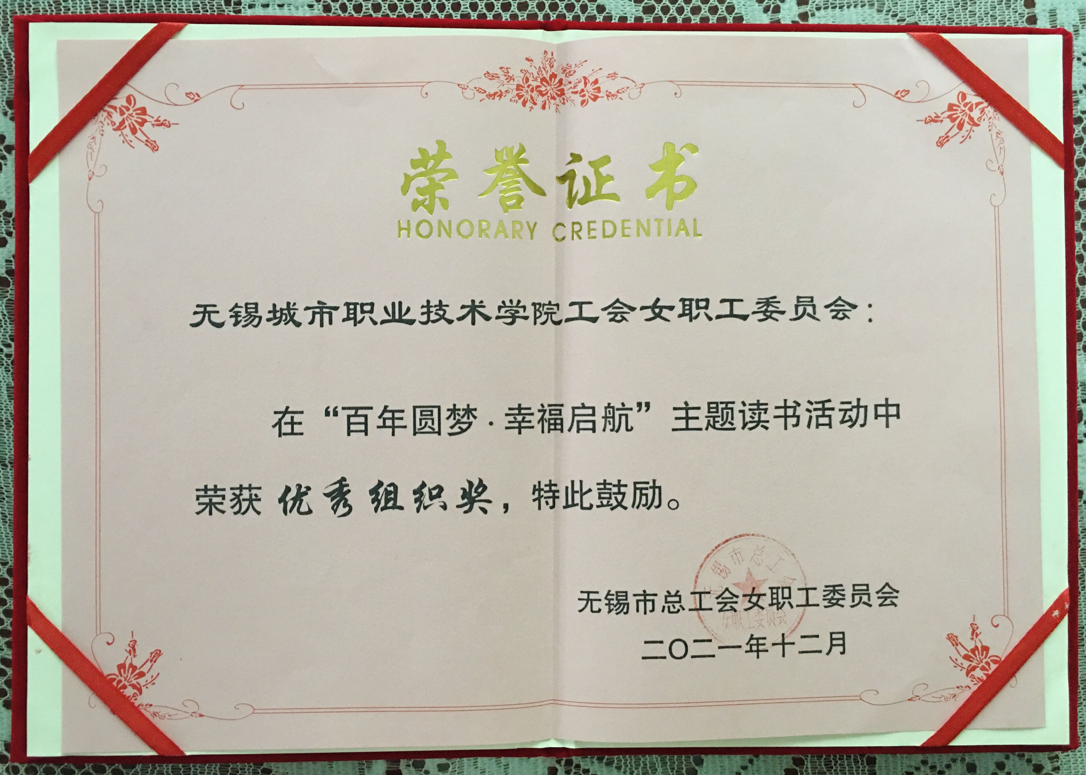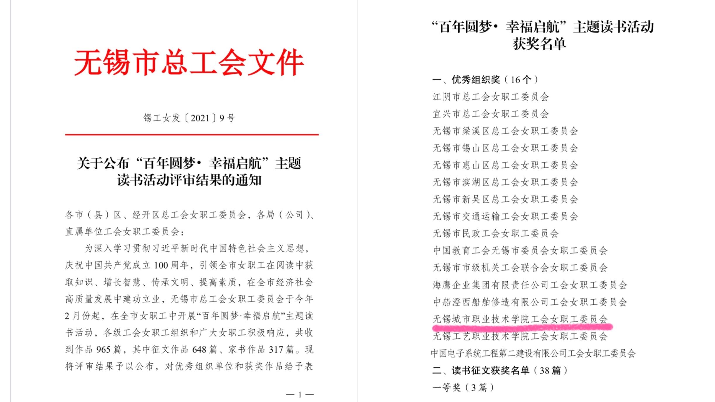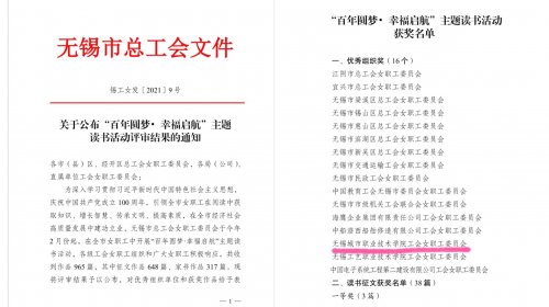 近日,我校女工委在2021年无锡市总工会举办的“百年圆梦·幸福启航”书香三八读书活动中荣获“优秀组织奖”。冯凌,刘芝澄、郭瑞等一批女教工的作品喜获省市级佳绩,费云霞、沈倩等原创诗歌朗诵《你在哪里》荣获2021年无锡市属学校“巾帼心向党·奋斗新征程”万名教师庆祝中国共产党成立100周年诗文演颂活动一等奖,并获无锡大市展演特等奖。