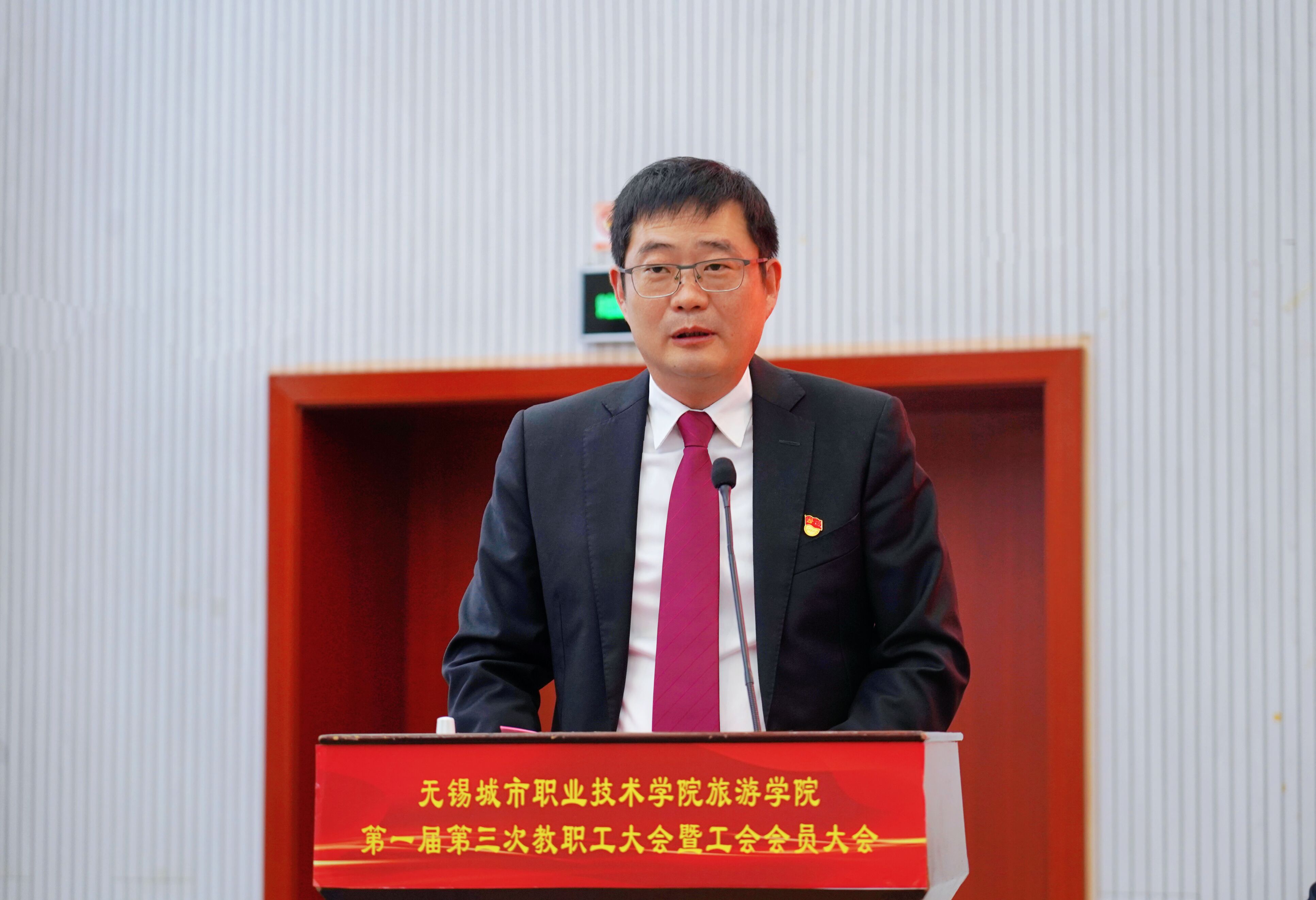 会议在庄严的国歌声中拉开帷幕。俞力元代表学校党委和行政对本次大会的召开表示热烈祝贺,他充分肯定了旅游学院近一年来在党政领导的科学化、民主化管理和全体教职工共同努力下所取得的各项成绩,并希望在座全体教职工学习贯彻党的二十大精神,落实市委教育工作座谈会和校第三次党代会精神,以创标志性成果,建高水平学校为奋斗目标,以省高等职业教育高水平专业群建设为主要抓手,进一步明确任务,不断创新人才培养模式,全面提高人才培养质量和办院水平,为学校高质量发展作出积极贡献。