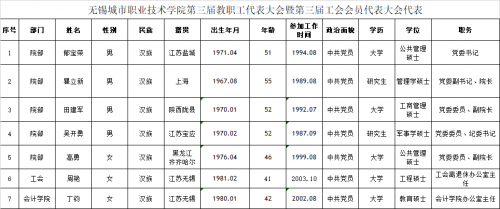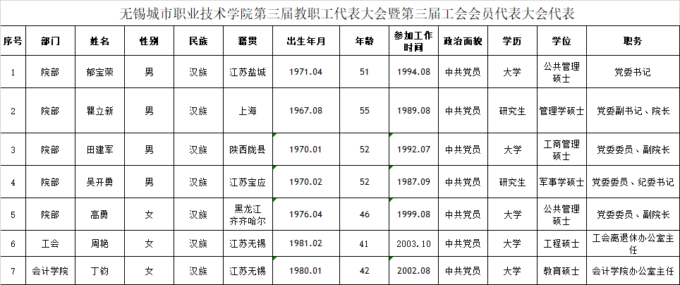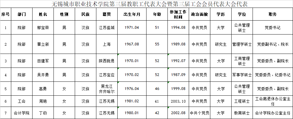 因第三届教代会、工代会正式代表调离、退休等原因,根据学校发展需要,经各二级单位教职工(代表)大会、工会会员(代表)大会选举,校工会审核,拟增补郁宝荣等7位同志为第三届教代会、工代会正式代表,现予以公示。