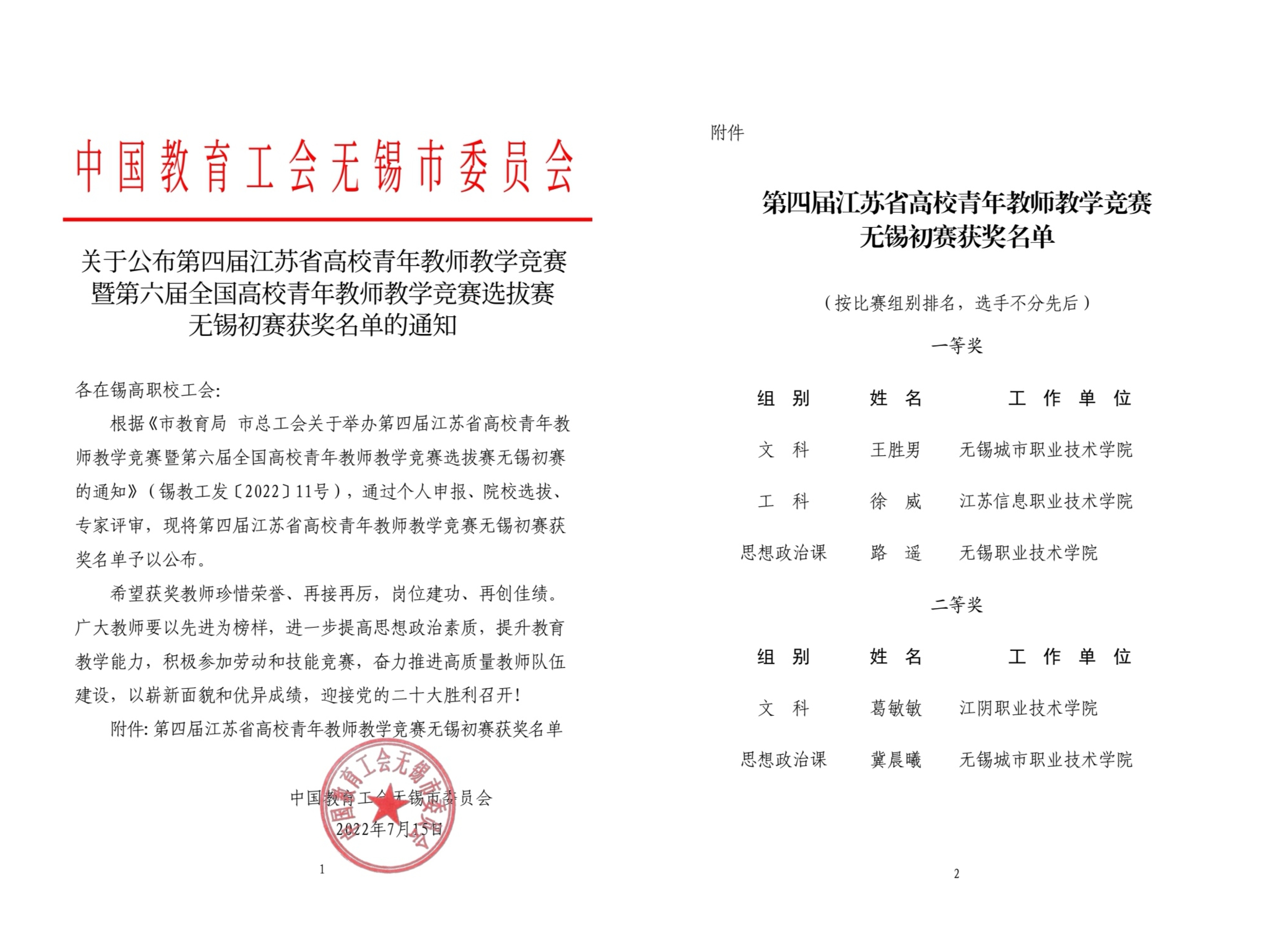 青年教师教学竞赛以“上好一门课”为竞赛理念,旨在促进高校青年教师队伍建设、提升青年教师教学能力,推动教育改革创新发展。竞赛内容由教学设计、课堂教学、教学反思和课程思政建设基础知识测试四部分组成。每位参赛教师赛前需提交一门课程的20个学时的教学设计和教学课件,比赛前半小时现场随机抽取其中1个学时进行课堂教学展示和反思,综合四部分的成绩得出总分。 作为首次参赛并承办无锡市赛的锡城高职院校,学校领导高度重视,要求相关部门全力以赴,组织好、服务好、保障好,确保参赛人员取得佳绩。按照校领导的工作要求,从市赛到省赛,学校提前谋划,协同联动,校工会广泛宣传动员,教务处积极选拔推荐,最终评选出王胜男(文科组)、冀晨曦(思想政治组)二名教师代表学校参加市赛,并获得无锡市一等奖、二等奖的好成绩。经无锡市教育工会评选,王胜男代表无锡市教育工会文科组参加省赛,校工会统筹协调、积极作为,为参赛教师提供良好保障、协助教师精心备赛。 青年教师教学比赛是全省引领性竞赛一级竞赛项目,与往届相比,竞赛规模和人数创新高,在竞赛内容、方法和评分规则等方面进行了创新。成绩优异的选手,将按条件和程序推荐申报“江苏省五一劳动奖章”“江苏省五一创新能手”“江苏省青年岗位能手”“江苏省技术能手”等荣誉。 高校青年教师教学竞赛是提升青年教师教学素质、立德育人能力的重要平台。今后,我校将进一步深入总结比赛经验,继续加强对青年教师“上好一门课”的教学能力的培养,为青年教师成长成才搭建更为宽广的平台,着力打造一支师德高尚、业务精湛的高素质教师队伍,推动我校教育教学事业不断迈上新台阶。(文/图:周艳;审核:鲁继业) | |||||