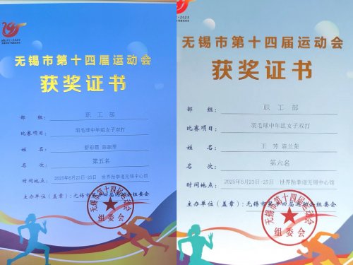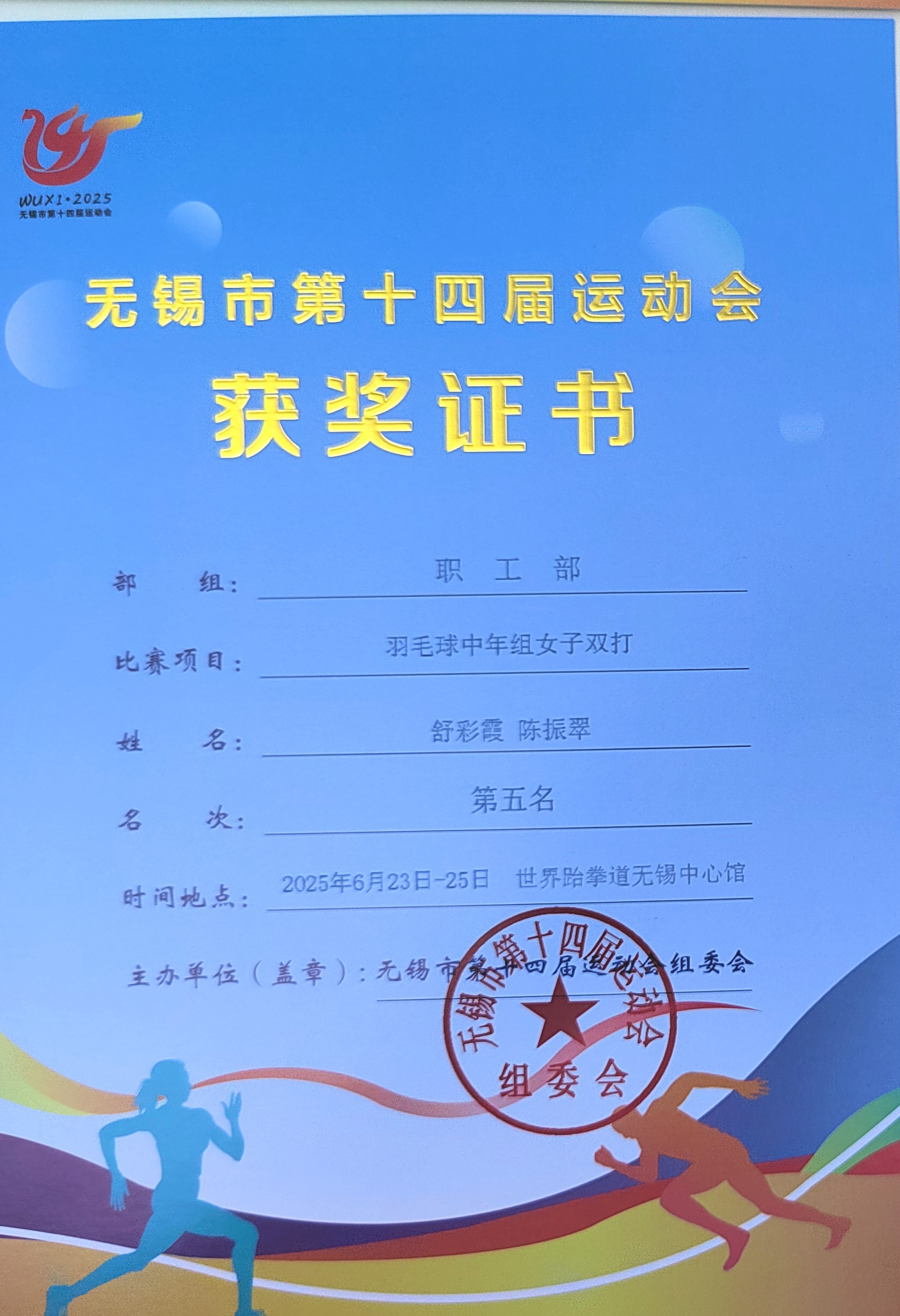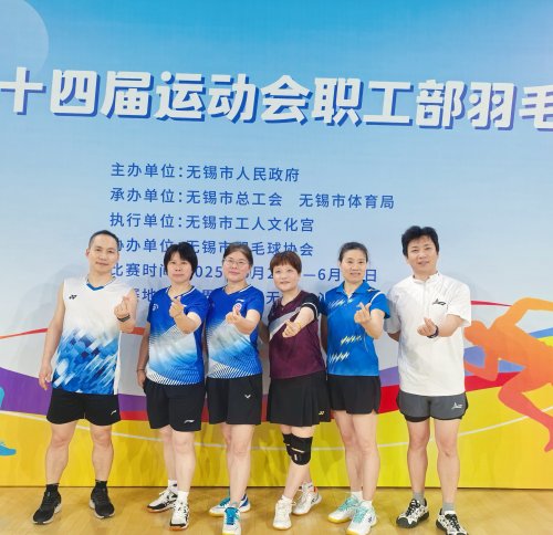 日,我校工会组织教职工羽毛球队出征无锡市第十四届运动会(职工部)羽毛球比赛,在高手云集的赛场上奋勇拼搏,斩获中年女双第五、第六名的佳绩,为校争光。  部分参赛选手 此次比赛项目丰富,团体赛与单项赛兼顾青年组和中年组多个类别。赛场上,我校参赛教职工精神抖擞,凭借扎实的技术功底和默契配合,在多轮对抗中过关斩将。尤其是中年女双选手,面对实力强劲的对手毫不畏惧,攻防转换间尽显风采,最终在激烈角逐中脱颖而出。